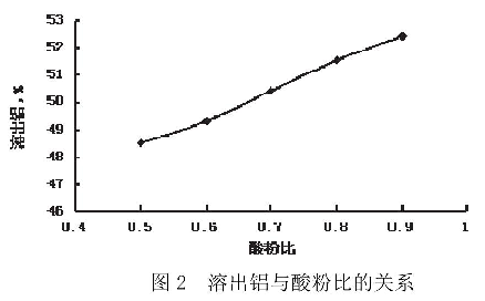 在酸液和反應溫度和時間不變的情況下改變酸粉比例,研究酸粉比與鋁酸鈣粉溶出鋁的關系。如圖2。